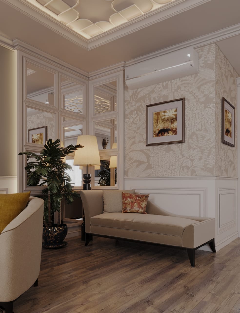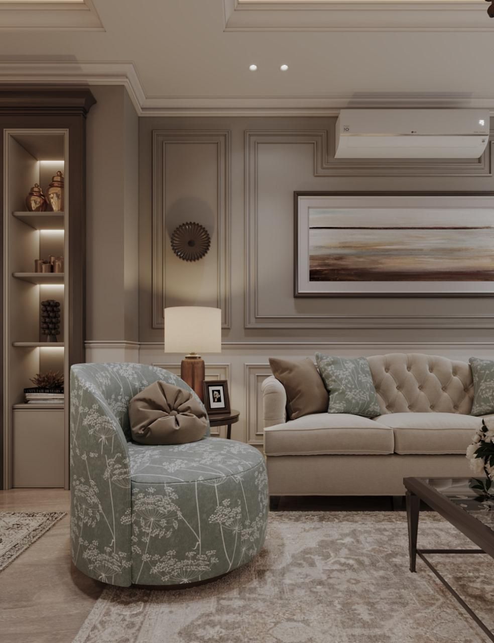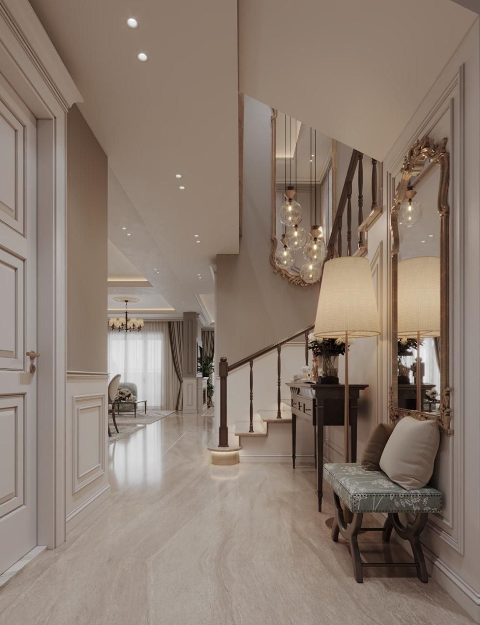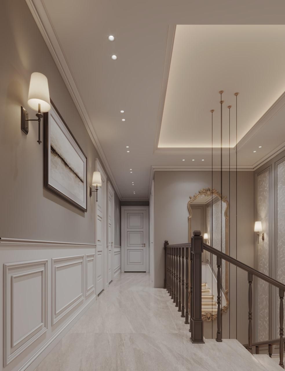 Experience the harmony of our latest Neo-Classical residential masterpiece. Every corner of this home is designed to evoke a sense of grandeur and calm. The entrance welcomes you with intricate wall moldings and a sophisticated palette. Luxurious marble flooring reflects the warm, ambient lighting throughout the space. A grand staircase stands as a focal point, bridging architectural strength with grace. In the living area, classic tufted furniture meets clean, modern silhouettes. Soft neutral tones are accented by rich wooden textures and gold metallic finishes. The bespoke fireplace serves as a cozy yet stately centerpiece for family gatherings. Intricate ceiling details and recessed lighting create a multi-layered visual experience. Floor-to-ceiling drapery adds a touch of dramatic softness to the natural light. Artistic wall panels and curated decor pieces breathe life into the transition spaces. The dining area is a testament to refined taste, featuring elegant, curved seating. Subtle floral patterns on upholstery provide a gentle nod to traditional aesthetics. Modern amenities are seamlessly integrated without disrupting the classical flow. Strategic use of mirrors enhances the sense of space and doubles the visual beauty. Warm wood railings provide a grounding contrast to the bright, airy corridors. Lighting fixtures are chosen as jewelry for the home, adding a sculptural touch. Every material is selected for its quality, durability, and timeless appeal. This project is more than just a house; it is a sanctuary of sophisticated style. Crafted with passion, designed for luxury, and executed to perfection.